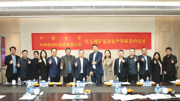 2023年1月9日上午,中南大學(xué)與中偉股份紅土鎳礦氫冶金產(chǎn)學(xué)研合作成功簽約。中南大學(xué)副校長郭學(xué)益,科學(xué)研究部部長李啟厚,冶金與環(huán)境學(xué)院副院長陳愛良,資源循環(huán)研究院副院長王親猛、童匯、李棟,科學(xué)研究部王李昌,中偉股份資深副總裁陶吳,高級副總裁兼董事會秘書廖恒星,首席專家馮德茂,總裁辦主任張惠海等領(lǐng)導(dǎo)出席見證簽約儀式。