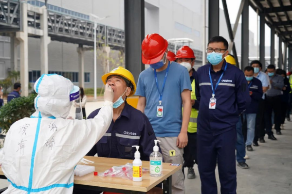一同堅守在抗疫一線的還有南部產業基地安環部。在接到防疫命令后的第一時間,他們緊急響應,連夜安排全體員工和施工方人員進行核酸檢測,在1天內完成了全部4000多名員工的核酸檢測,并安排人員在基地進行24小時值守,勸阻非必要人員進出基地,協助維持秩序,收集和了解基地員工的緊急需求,筑牢疫情防線。以人為本 眾志成城兵馬未動,糧草先行。南部產業基地后勤保障組連日來與時間賽跑、克服困難,圍繞園區人員飲食保障、廠區公共區域全覆蓋的保潔消殺、防疫物資的調度發放、管牢疫情防控大門等多項工作,全力做好服務保障。